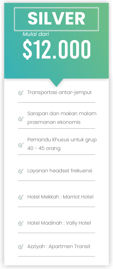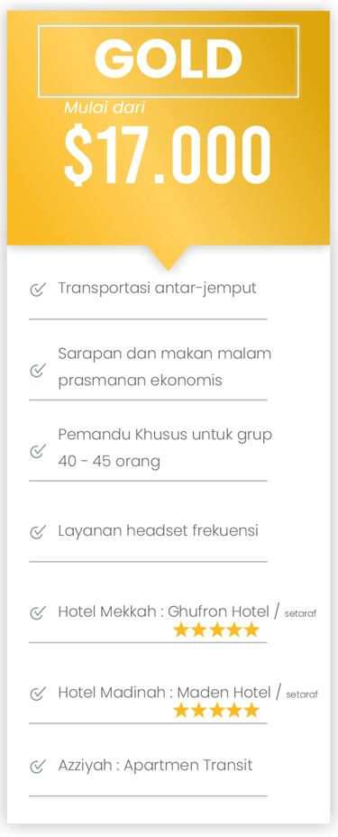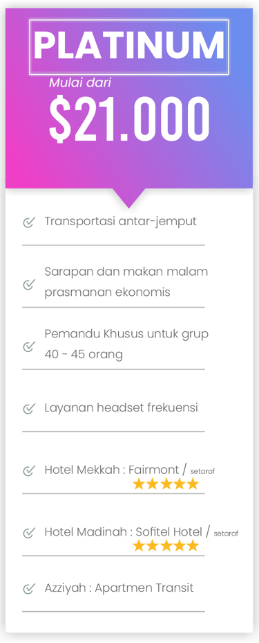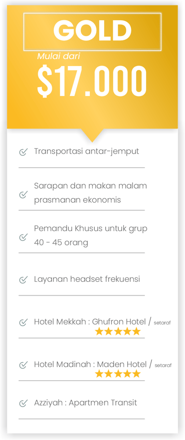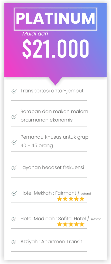Kuota resmi pemerintah RI dengan bimbingan ibadah ekslusif. Nikmati fasilitas premium untuk ibadah yang lebih nyaman.